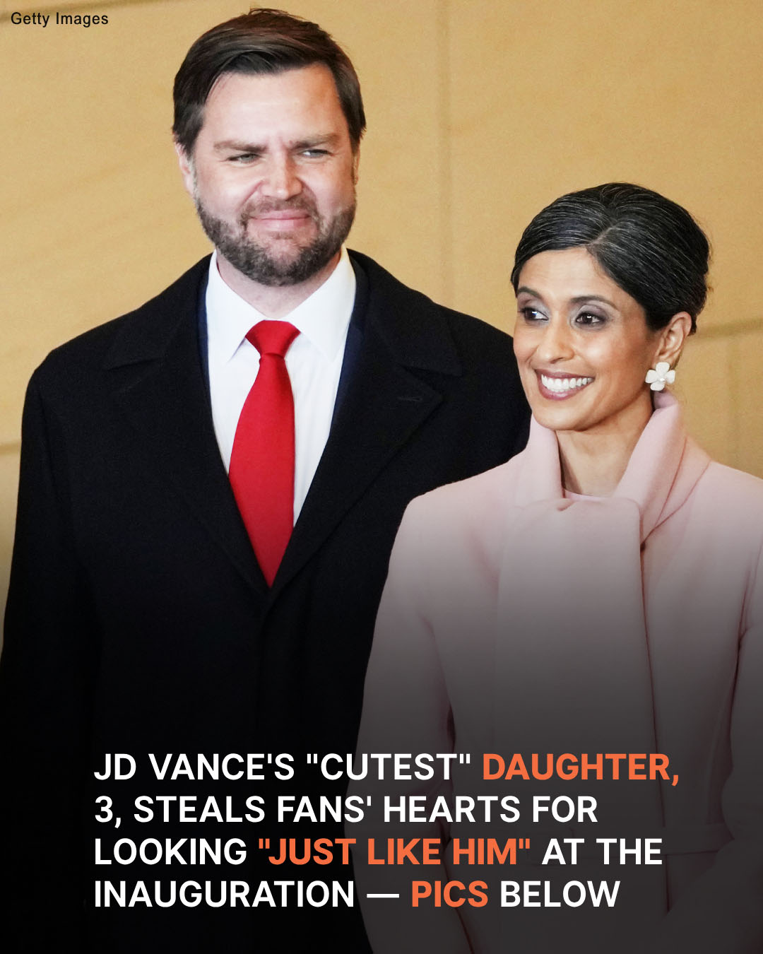 In one photo, the Vice President, in a dark blue suit, waves to the crowd while holding his daughter, Mirabel, dressed adorably in a cream-colored outfit with tights and shoes. Usha, wearing a soft pink dress and gray boots, walks beside J.D., holding the hands of their sons, Ewan and Vivek, in matching blue suits.