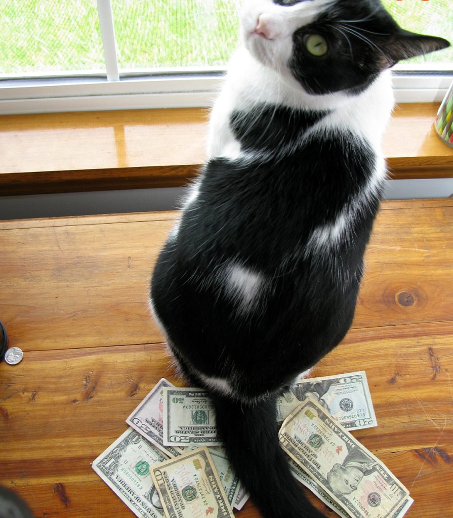 Wendy grabbed the cat the moment he crawled through the cat flap. He was carrying a twenty-dollar bill!