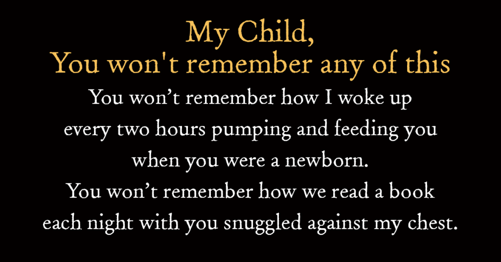 You won’t remember how I woke up every two hours pumping and feeding you when you were a newborn.